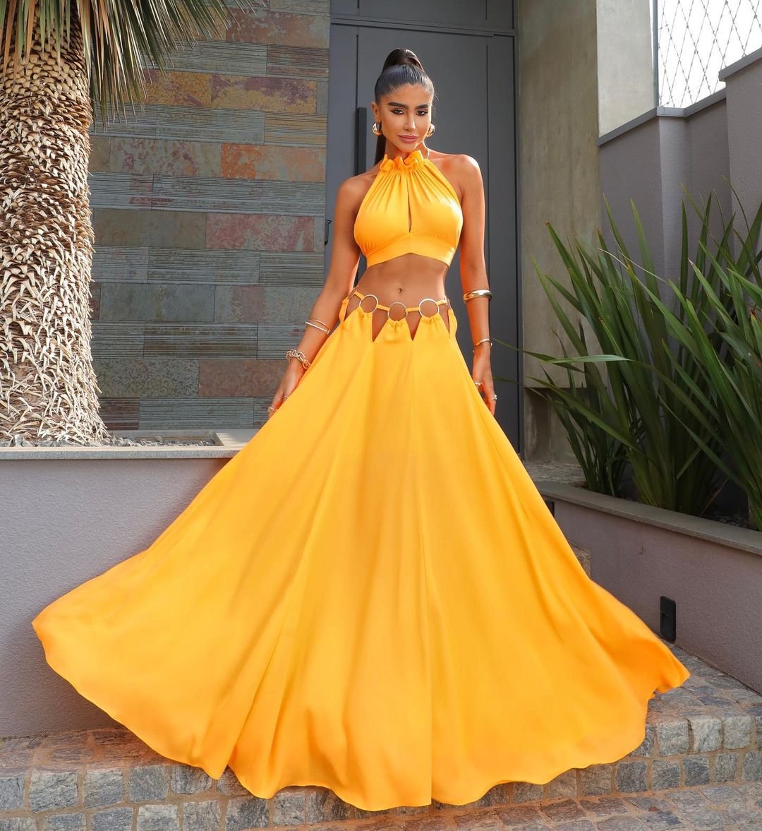 Conjunto saia longa e cropped super despojado, em composição 100% poliéster, o tecido é o Crepe Musseline. A saia possui argolas douradas em todo o entorno da cintura, o cropped possui detalhes franzidos com shocker de metal em dourado. Look adequado para eventos casuais e festivos.